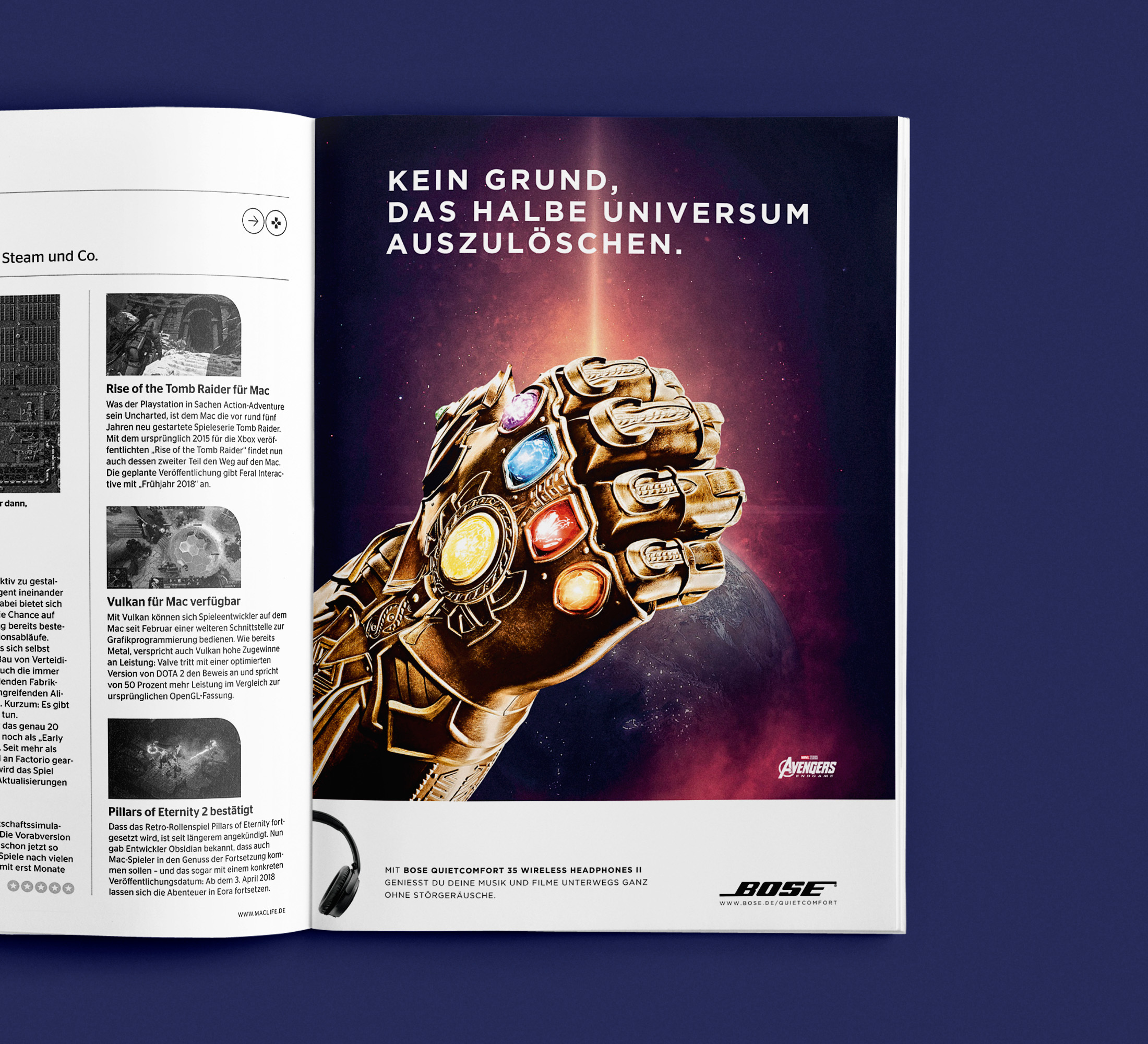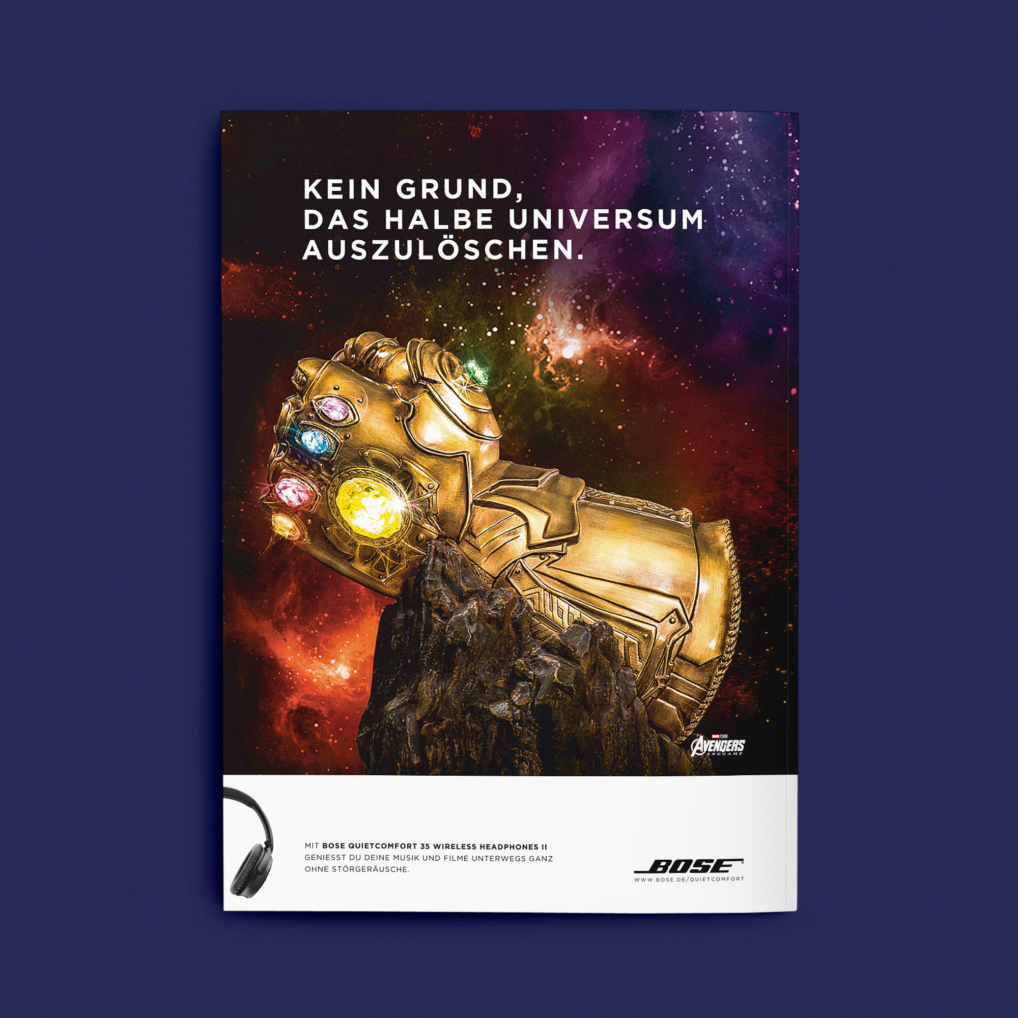 Fiktives Anzeigenkonzept für die Quietcomfort 35 Wireless Headphones II von BOSE angelehnt an die Filme des „Marvel Cinematic Universe“.